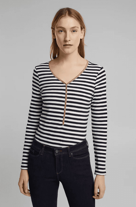 Aquesta samarreta de màniga llarga amb coll Henley i ratlles, confeccionada en cotó ecològic d'alta qualitat, aporta un estil esportiu al teu dia a dia.