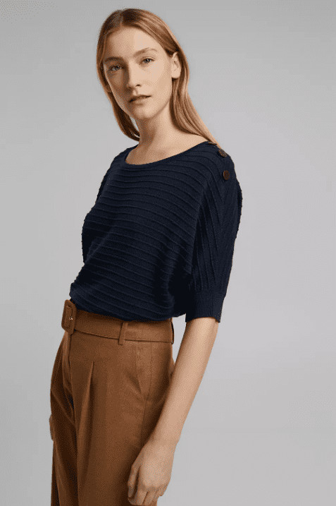 Aquest modern jersei de punt amb cotó ecològic d'alta qualitat fascina amb super textura de ratlles fines i els detalls de botó decoratiu.