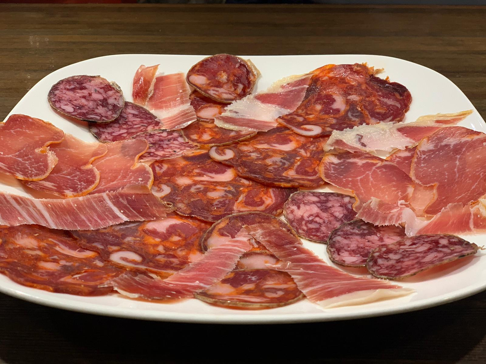 Assortiment d'Embotits Ibèrics: llom, xoriço, bull, llonganissa i pernil enceball tallat a mà.