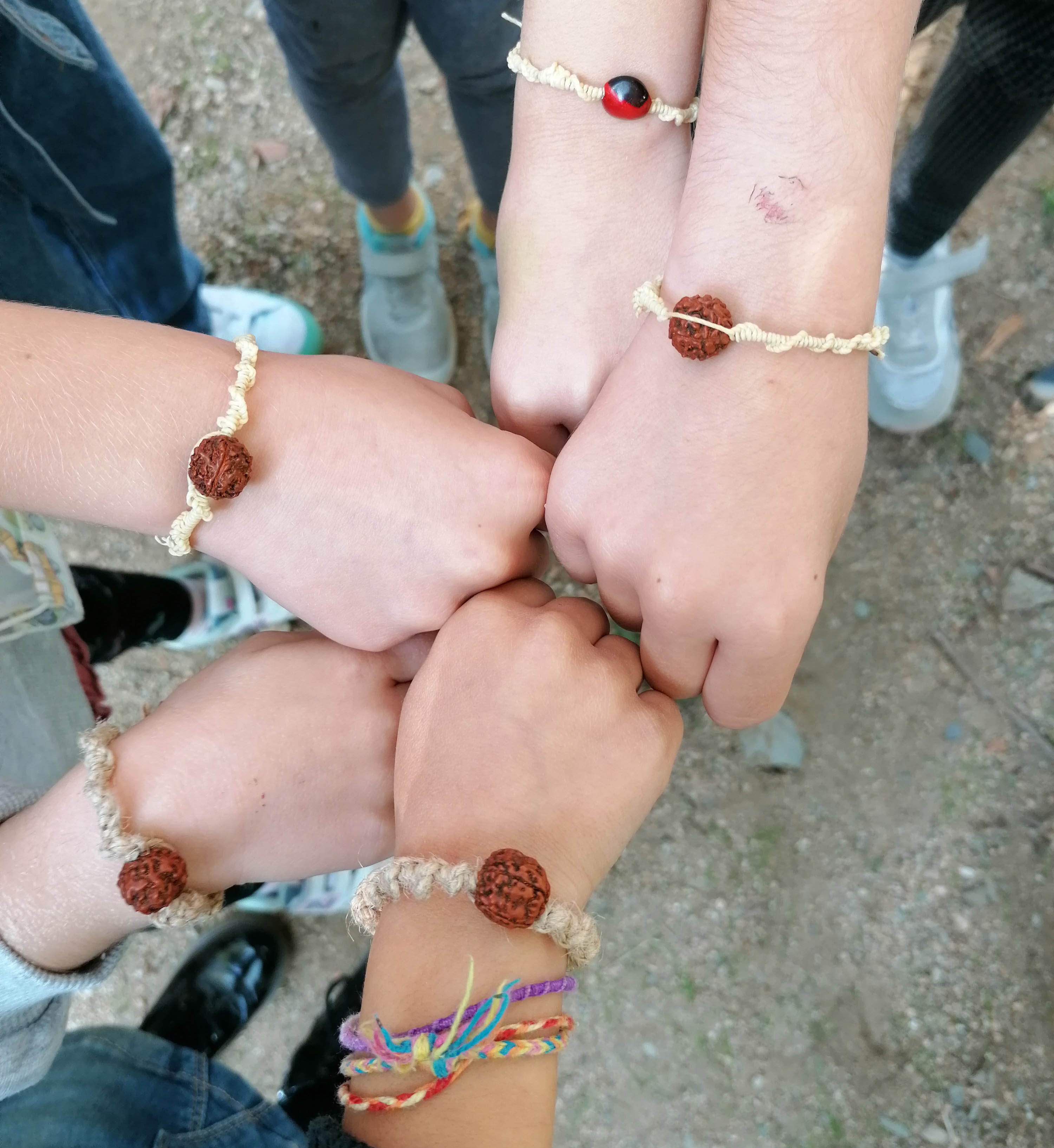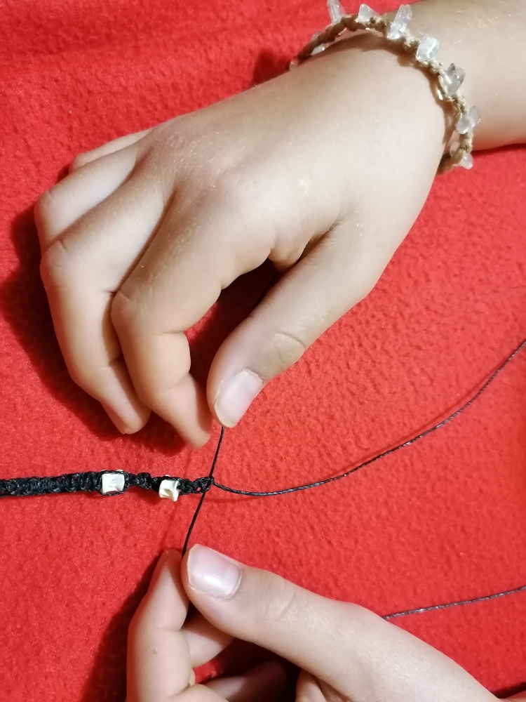 Com que hi ha una varietat infinita de nusos, per començar ensenyarem com es pot fer un braçalet amb un nus simple, només amb dos fils; així els participants s’aniran familiaritzant amb com s’agafen i es tiben els fils. Un cop finalitzat, passarem a ensenyar com es fa un nus pla, que és una mica més complicat. Als braçalets es podran posar boletes de vidre de colors o pedretes; nosaltres posem el fil encerat, que és perfecte per fer macramé, però podem buscar altres materials si es desitja (com el cànem).