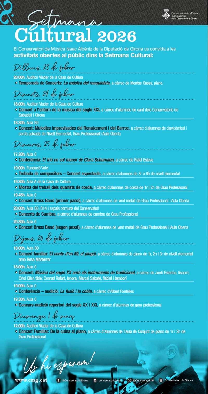 Un any més, el Conservatori de Música Isaac Albéniz de la Diputació de Girona presenta la Setmana Cultural. Del 23 de febrer a l'1 de març es duran a terme una setantena d'activitats, entre les quals n'hi ha catorze que s'adrecen a tota la ciutadania. Entre aquestes, el 23 de febrer tindrà lloc el concert La música del maquinista, que forma part de la Temporada de Concerts. Serà a les 19.30 h a l'auditori Josep Viader de la Casa de Cultura de Girona. En aquesta ocasió, la pianista Montse Cases, professora del centre, ha volgut retre un homenatge al centenari de l'estrena de la pel·lícula El maquinista de la general, la llegendària comèdia del 1926, dirigida i protagonitzada per Buster Keaton.