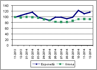 Evolució de l'atur registrat (11-2013 -> base 100)